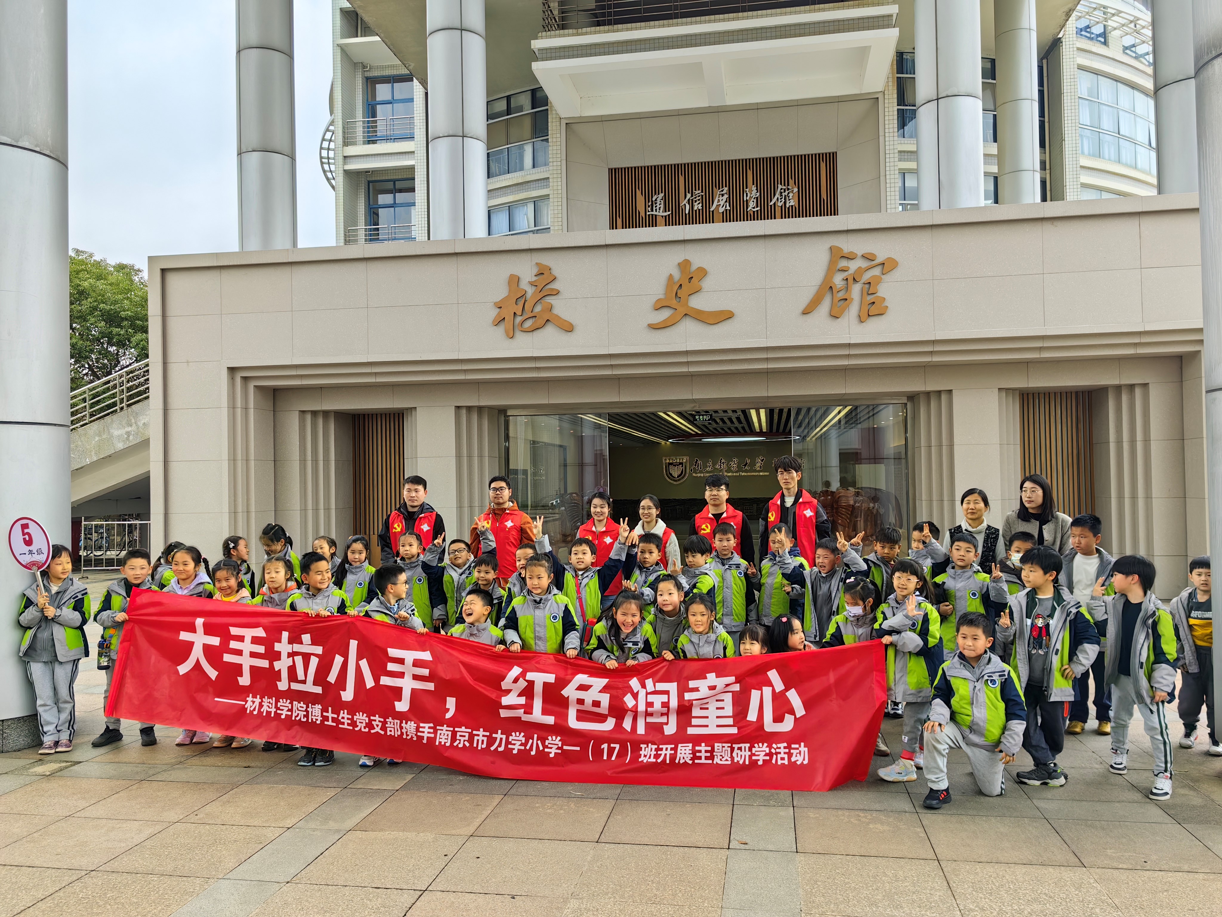 2024年3月28日,腐漫画 博士生党支部携手南京市力学小学一(17)班开展“大手拉小手,红色润童心”主题研学活动。博士生党支部部分党员、入党积极分子以及南京市力学小学一(17)班师生一行近60人参加。本次活动是博士生党支部开展的面向社会的党群共建志愿服务活动,得到了学院党委以及学院新能源材料与器件系党支部的大力支持。