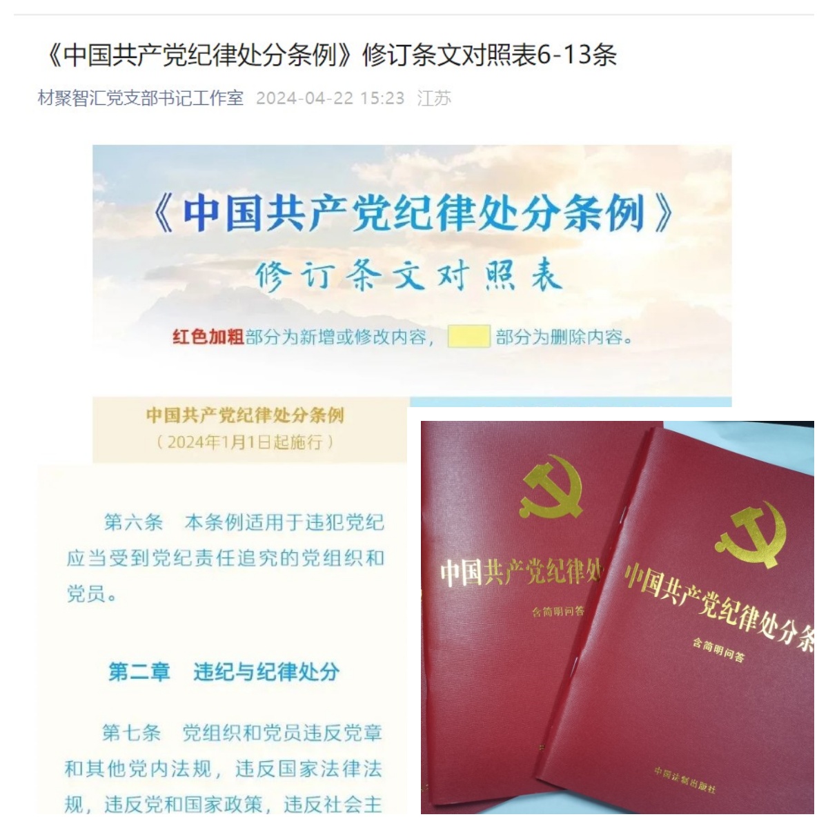 4月17-18日,学院党委各支部召开支部大会、支委会,研讨支部党纪学习教育相关工作。4月22日,学院党委为各支部发放《中国共产党纪律处分条例》学习资料,要求各支部原原本本学习《中国共产党纪律处分条例》。学院高分子材料与工程系党支部的“材聚智汇党支部书记工作室”微信公众号定期推送《中国共产党纪律处分条例》修订相关内容,加强理论学习。