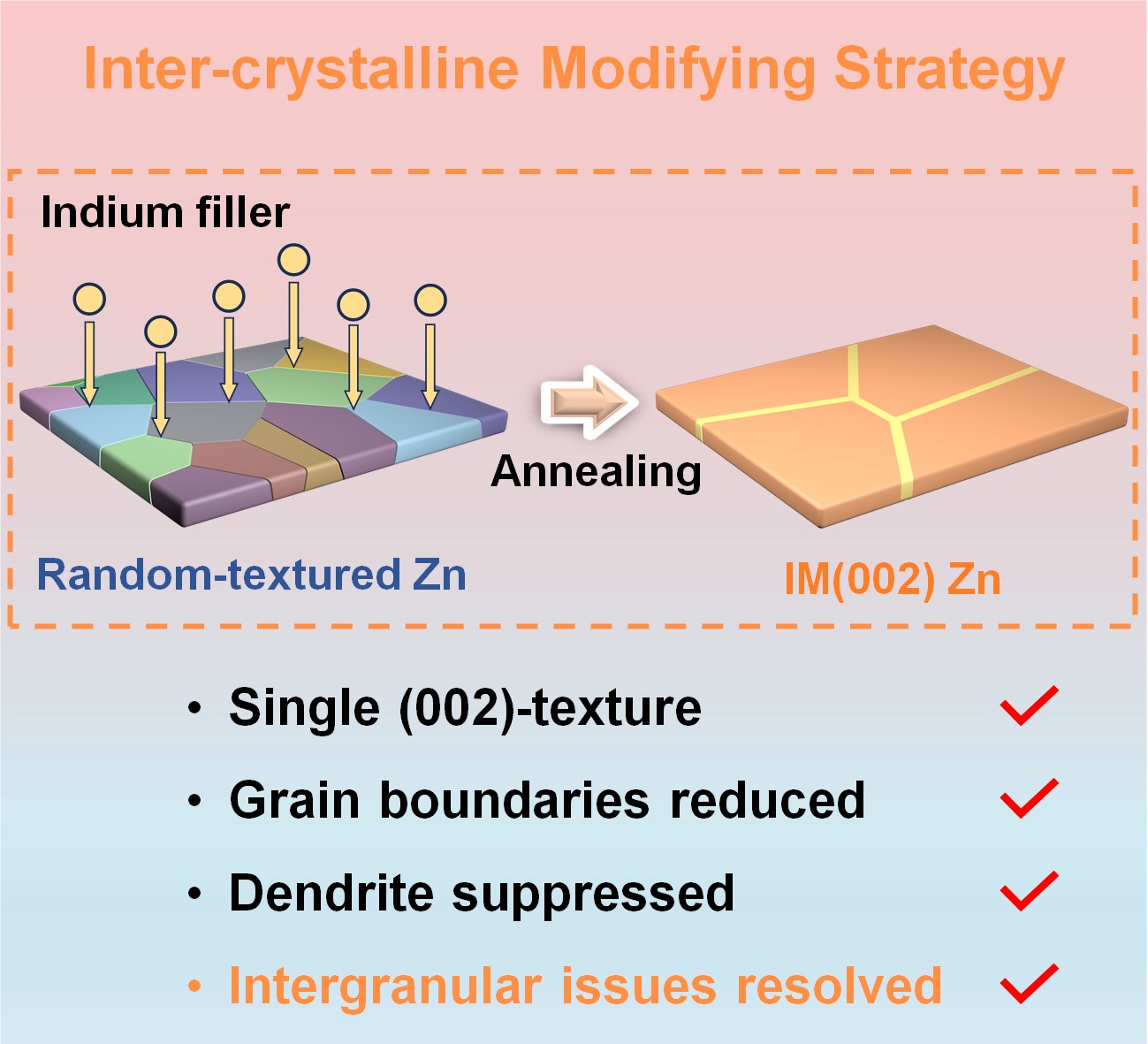 水系锌电池由于极高的安全性、低成本、环保、工艺简单等优点而得到了广泛的研究和关注,有望成为电网级大规模储能的领先技术。但锌负极仍然面临着枝晶生长、析氢和腐蚀的问题,限制了水系锌电池的实际应用。为解决上述问题,将锌负极设计成以(002)晶面为主导织构的晶面调控策略被认为是最有效的方法之一。尽管在锌的织构调节方面已经取得了很大进展,但金属晶界的不利影响却往往被忽视。因为在(002)织构锌中存在着大量晶粒,从金属腐蚀的角度来看,晶间区域的反应活性要高于在晶内区域。因此,这些高活性的晶间区域会产生不必要的优先锌沉积和副反应(腐蚀、析氢),严重阻碍(002)织构锌负极的稳定运行。