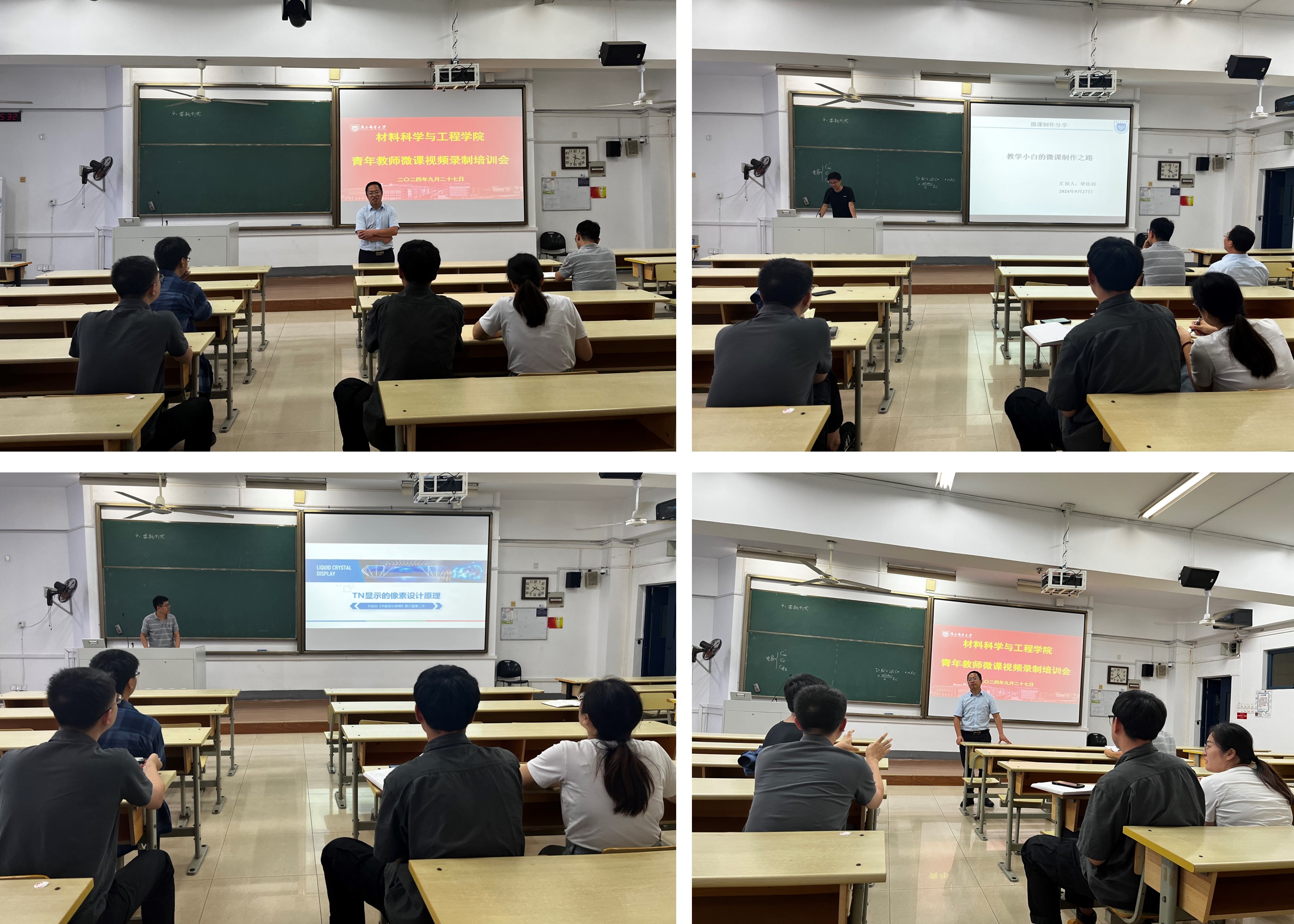 宋院长指出,微课作为一种新型的教学资源,不仅能够丰富教学手段,还能够激发学生的学习兴趣,促进教学相长。会上,学院邀请了李明光和梁铭利两位老师进行经验分享。李明光老师是第五届全省高校青年教师教学竞赛工科组一等奖获得者,他以《TN显示的像素设计原理》为例,从课程导入、PPT制作、知识框架、板书设计及思政元素的融入等方面对如何设计并上好一堂课程进行了深入浅出的剖析。之后,“2024年‘领航杯’江苏省教师信息素养提升实践活动”参赛教师梁铭利分享了他的微课参赛作品制作经验。他从青年教师导师制微课视频录制和微课竞赛视频录制的区别出发,与大家分享了他在课程内容选定、素材收集、讲稿脚本制作及视频录制等方面的体会,并带领大家共同学习了其他高质量微课视频,分享学习心得。两位老师的经验分享,不仅让参会青年教师受益匪浅,更激发了大家对于微课制作的热情。培训会期间,参会教师积极互动,就自己在微课视频录制过程中遇到的问题与两位老师深入交流。