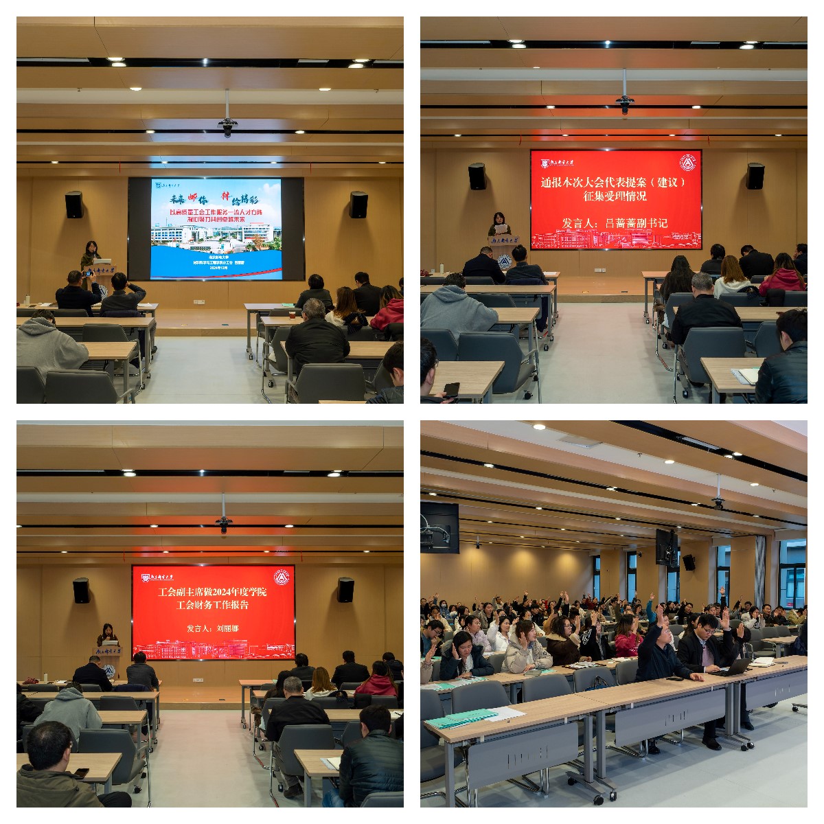 会议在庄严的国歌声中拉开帷幕,吕蔷蔷主席宣读校工会关于大会的批复意见,会议听取学院院长范曲立做2024年学院工作报告及2025年工作重点,工会主席吕蔷蔷做题为《以高质量工会工作服务一流人才方阵,凝心聚力共创卓越未来》的学院2024年工会工作报告,工会副主席刘丽娜做2024年工会财务报告,接着全体与会人员共同讨论腐漫画 工作报告、第二届工会委员会工作报告和工会财务工作报告,并表决通过了以上工作报告。分工会副主席吕蔷蔷汇报了上次大会代表提案(建议)处理情况和本次大会代表提案(建议)征集受理情况。随着国际歌曲终,大会圆满落幕。