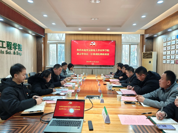 为进一步加强学习调研,高质量开展党建“双创”标杆院系建设,材料科学与工程学院党委书记高志华带队,以“走访调研学经验,对标先进取真经”为目的,赴相关兄弟高校开展党建联动、调研学习。2024年12月26日,材料科学与工程学院党委书记高志华、党委副书记吕蔷蔷、江苏省特色党支部书记/高分子材料与工程系党支部书记黄艳琴、第二批全省党建工作“样板支部”培育建设单位/材料物理系党支部书记李明光、第三批全国高校“百个研究生样板党支部”创建单位/博士生党支部书记方栋、学院党委组织员刘丽娜一行7人,就高校党建“标杆院系”建设情况开展调研交流。南京林业大学材料科与工程学院党委书记孟国忠、党委副书记蔡志敏、木材科学与工程系党支部书记黄润州、能源动力与工程系党支部书记徐德良、组织员徐晔晗以及有关工作人员参加此次交流活动。