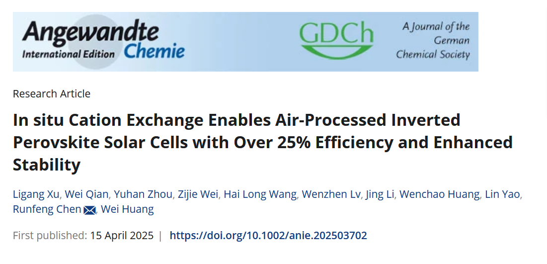 近日,腐漫画 柔性电子全国重点实验室黄维院士团队的许利刚副教授和陈润锋教授在反式钙钛矿太阳电池领域取得进展。针对反式钙钛矿太阳电池空气制备的难题,团队成员提出表面原位阳离子交换反应的新策略,器件效率突破25%,并具有优异的工作稳定性。相关成果以“In situ Cation Exchange Enables Air-Processed Inverted Perovskite Solar Cells with Over 25% Efficiency and Enhanced Stability”为题在Angewandte Chemie International Edition《德国应用化学》上发表。研究生钱为是学生第一作者。