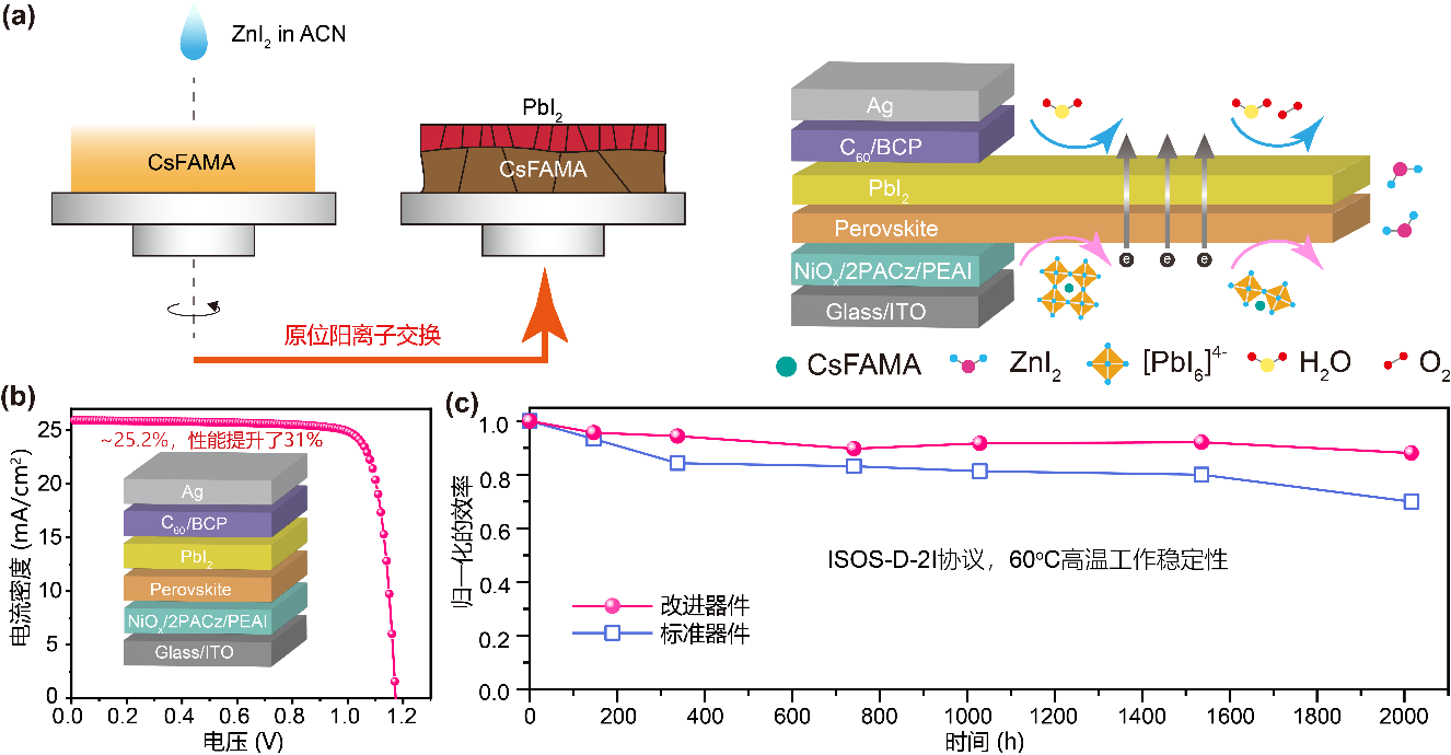 在该项工作中,团队成员利用表面原位阳离子交换技术,减少表面未配位的铅缺陷,生成致密的PbI2壳层,具体是利用ZnI2和乙腈(ACN)在钙钛矿表面旋涂,原位生成该壳层,最终显著地提升器件性能。在60 ± 10%湿度环境中,实现了25.2%的效率,稳定性通过了ISOS-D-1I(4770小时)和ISOS-D-2I(2000小时)测试。该技术为钙钛矿光伏技术的规模化应用提供了绿色、低成本解决方案。