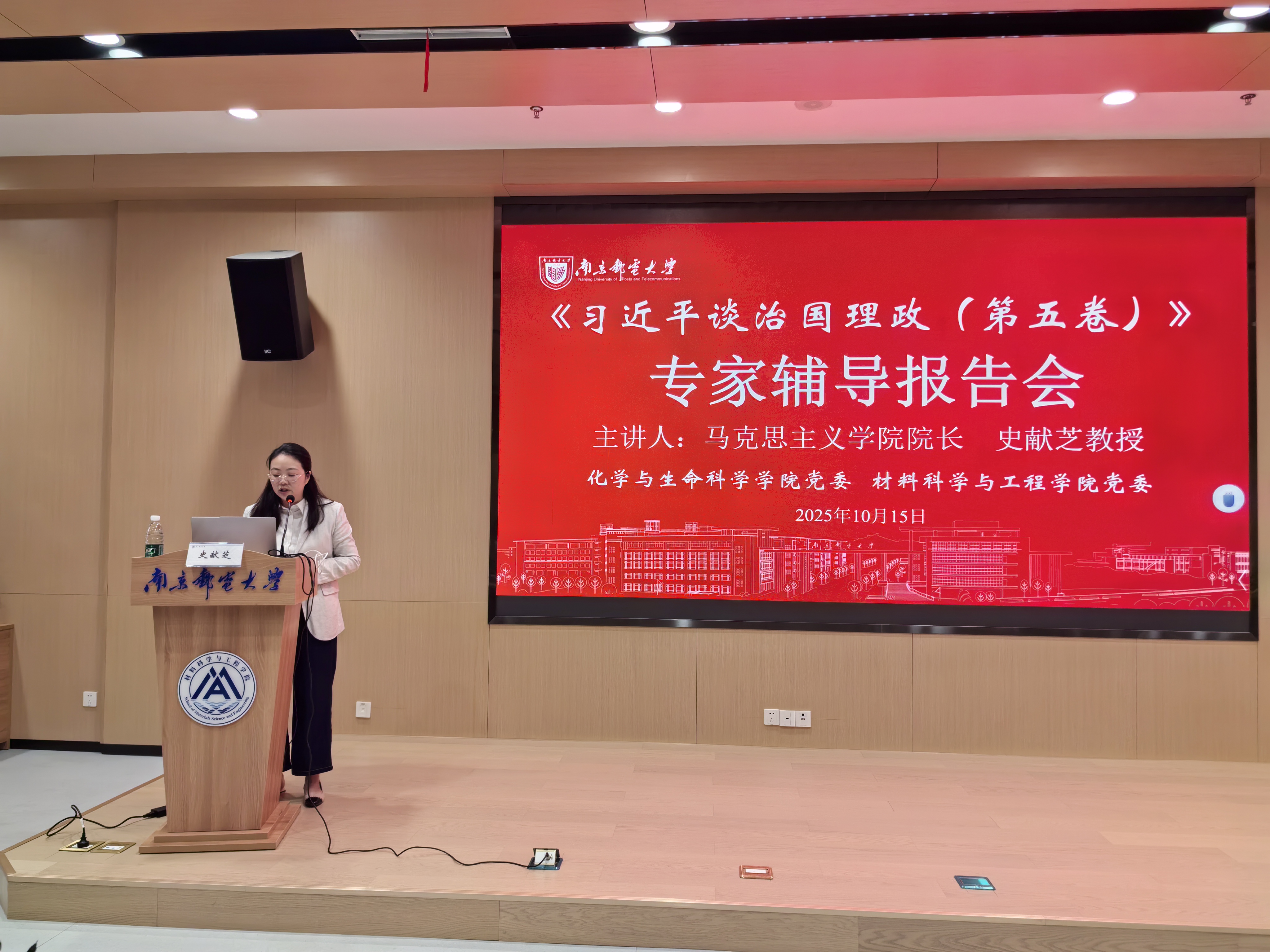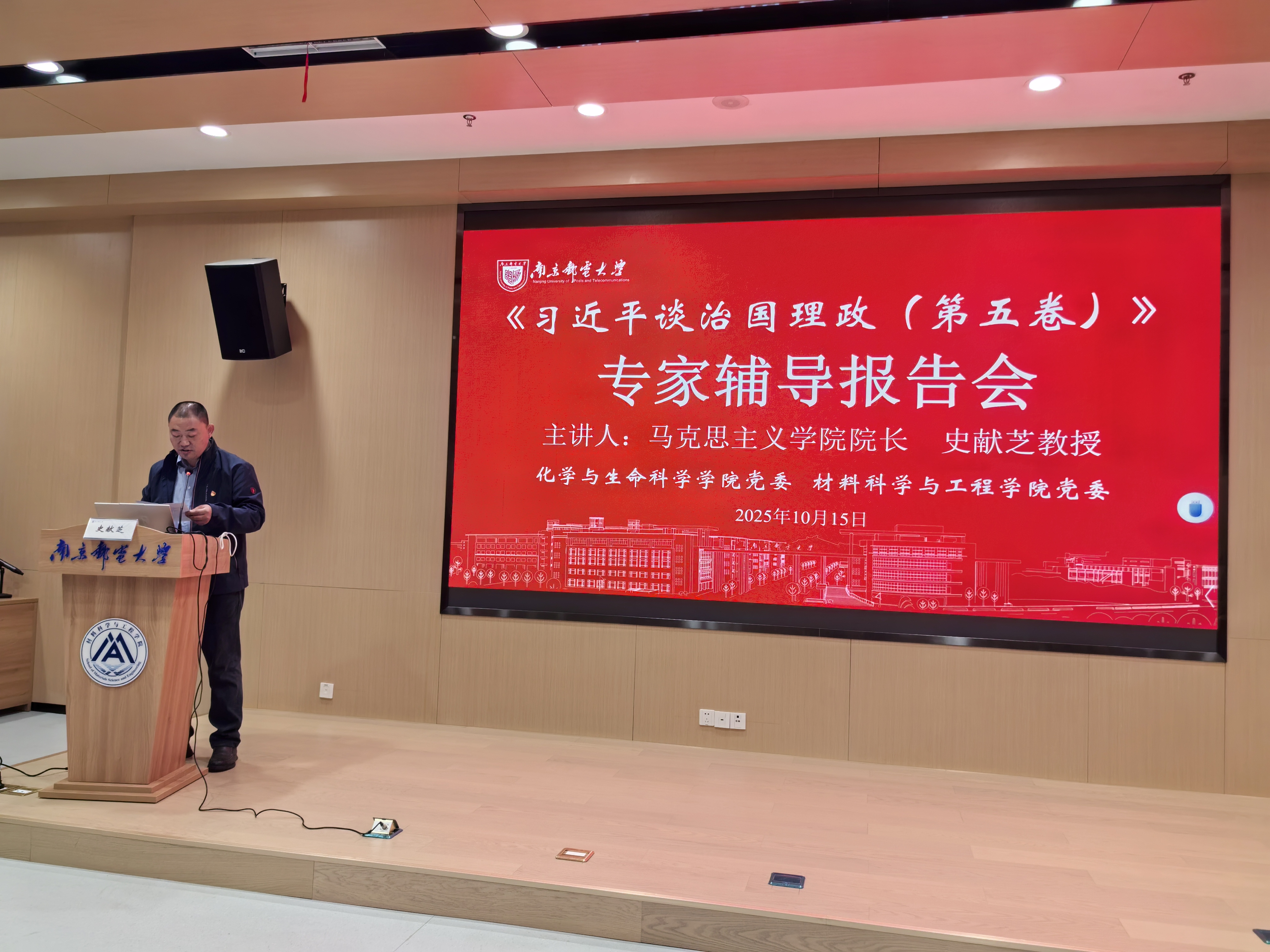 为深入学习宣传贯彻《习近平谈治国理政》(第五卷)重点内容,2025年10月15日下午,材料学院党委与化生学院党委联合组织《习近平谈治国理政》(第五卷)专题辅导报告会,报告会邀请腐漫画 马克思主义学院院长、博士生导师史献芝教授主讲,材料学院党委与化生学院党委理论中心组成员、教师党员及学生党员代表、教师支部积极分子参加了本次报告会。