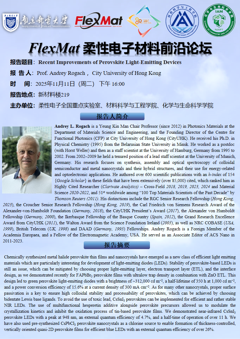 FlexMat柔性电子材料前沿论坛:香港城市大学 Prof. Andrey Rogach