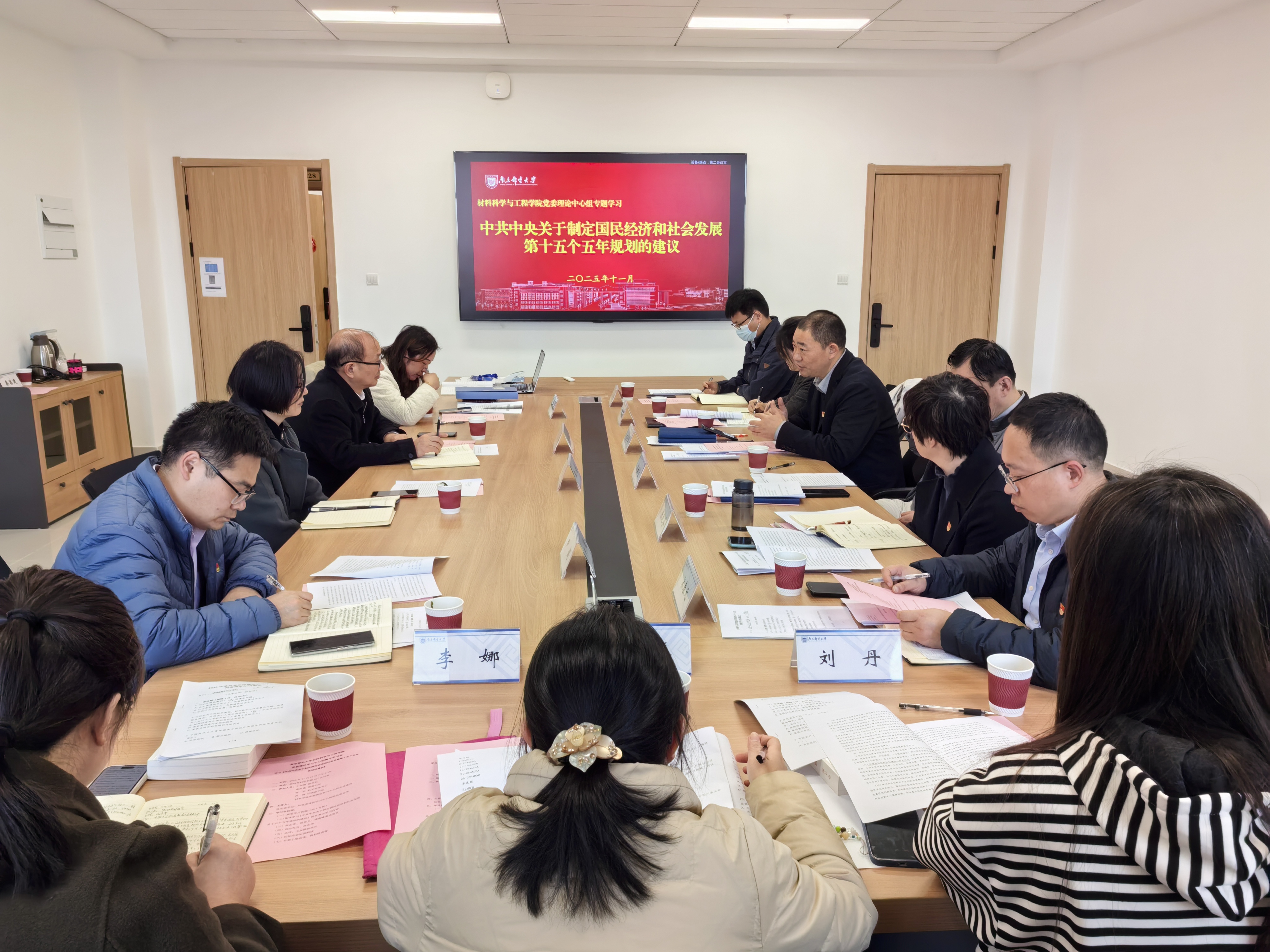 2025年11月27日下午,腐漫画 党委理论学习中心组以“中共中央关于制定国民经济和社会发展第十五个五年规划的建议”为主题,在仙林校区材料学科楼第二会议室开展专题学习,校党委常委、副校长王友国,机关党委书记张宏,团委副书记冯朦一行到会进行了旁听指导。学院党委理论学习中心组成员参加学习会,会议由学院党委理论学习中心组组长、党委书记高志华主持。